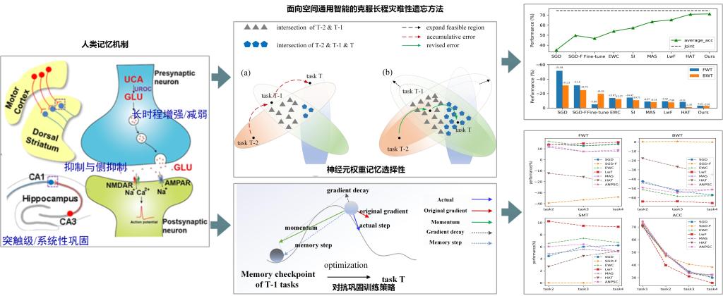 以深度学习为基础的人工智能技术已经在空间大数据理解和分析中展现出强大的竞争力。然而,现有深度学习构建在封闭世界假设基础上,在开放世界下,空间大数据时空谱异质性、动态性和不确定性导致深度学习面临模型迁移和泛化灾难问题。受人类大脑神经元突触可塑性机制启发,中南大学地理时空数据挖掘与智能服务团队提出了一种克服长程灾难性遗忘的方法,通过神经元权重记忆选择性与对抗巩固训练策略,赋予空间大数据智能以长程记忆和终身持续学习能力,减缓开放世界中深度神经网络模型的迁移和泛化灾难。研究成果在通往下一代空间通用智能的道路上迈出坚实一步。