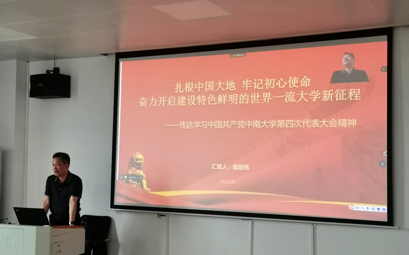 2022 年6月10日下午,戴前伟院长在地科楼338通过线上线下相结合的方式为应用地球物理系教工支部、应用地球物理系博士生支部及地信院本科毕业生党员讲授了题为《扎根中国大地 牢记初心使命 奋力开启建设特色鲜明的世界一流大学新征程》的专题党课,传达学习了中国共产党中南大学第四次代表大会精神。