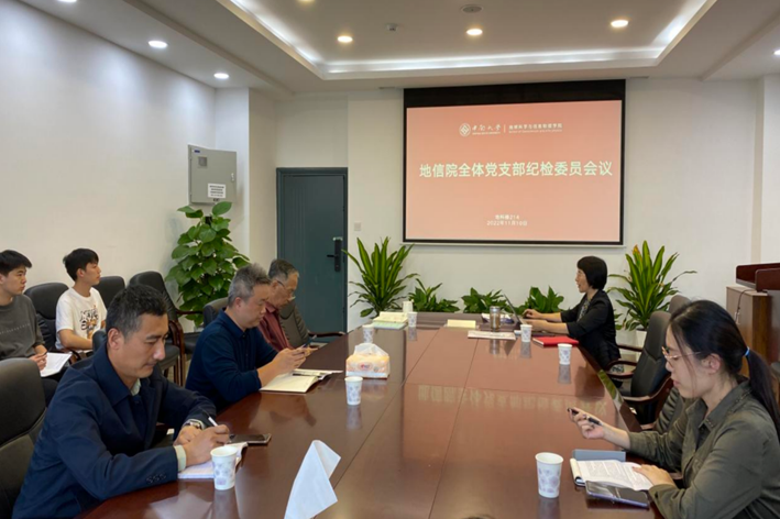 2022年11月10日下午,地信院党支部纪检委员培训会于地科楼214会议室顺利举行,地信院党委副书记李建军、专职组织员彭光雄、全体教工党支部及学生党支部纪检委员参会。