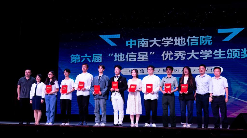 第一篇章结束后,晚会现场举行了地信院第六届“地信星”优秀大学生颁奖仪式,由地信院党委副书记李建军、副院长李志伟、副院长冯德山,中南大学团委学生会、研究生会秘书长邸可达对荣获该奖项的9位个人及集体颁发证书,以示表彰。