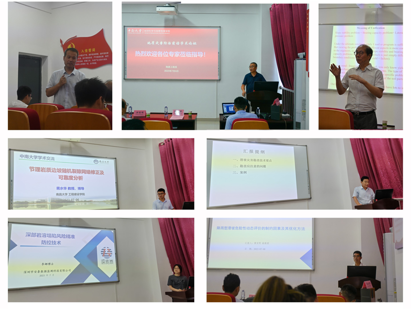 地质工程系党支部书记刘磊磊副教授的邀请,香港理工大学郑榕明教授、湖南省地质院一级调研员盛玉环教授级高工、青岛理工大学李亮教授、南昌大学蒋水华教授和黄发明副教授以及深圳市安泰数据监测科技有限公司副总经理李娜高级工程师来校开展学术交流,围绕“地质灾害成灾机理、监测预警、风险评价”等学科前沿,给地质工程系近50名教师、研究生、本科生及留学生带来一场高水准的学术盛宴,也极大促进了地质灾害防治理论、方法与技术的创新与发展,进一步推动了地质灾害防治最新理论与技术的产学研用一体化。地信院党委书记邵拥军教授、地质工程系主任孙平贺教授、肖婷讲师、朱凌讲师、长沙理工大学陈文胜教授、湖南省地质灾害调查监测所、湖南省地质灾害监测预警与应急救援工程技术研究中心王璨、姚腾飞等参加论坛活动,地质工程系副主任张鑫鑫副教授主持论坛。