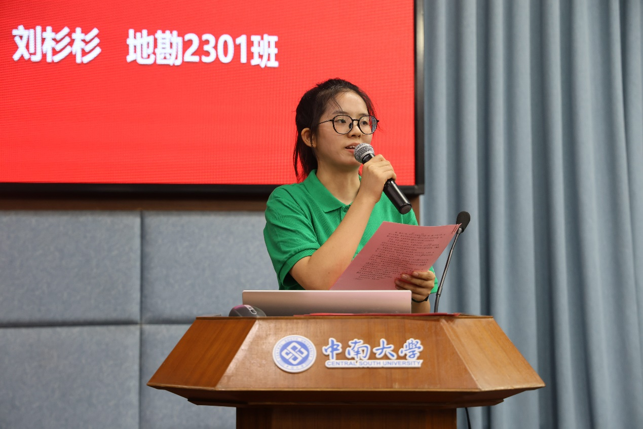 大会最后一项,2023级新生代表刘杉杉同学发言。刘杉杉同学在发言中讲到,“我们跨山越海奔赴此地,就是为了发出更璀璨的光芒”,中南大学和地信院为同学们提供了更加广阔的舞台,在崭新起点上,2023级新生要不忘初心,踔厉奋发,用汗水书写无悔青春。