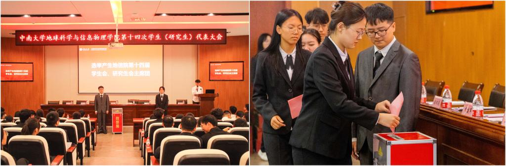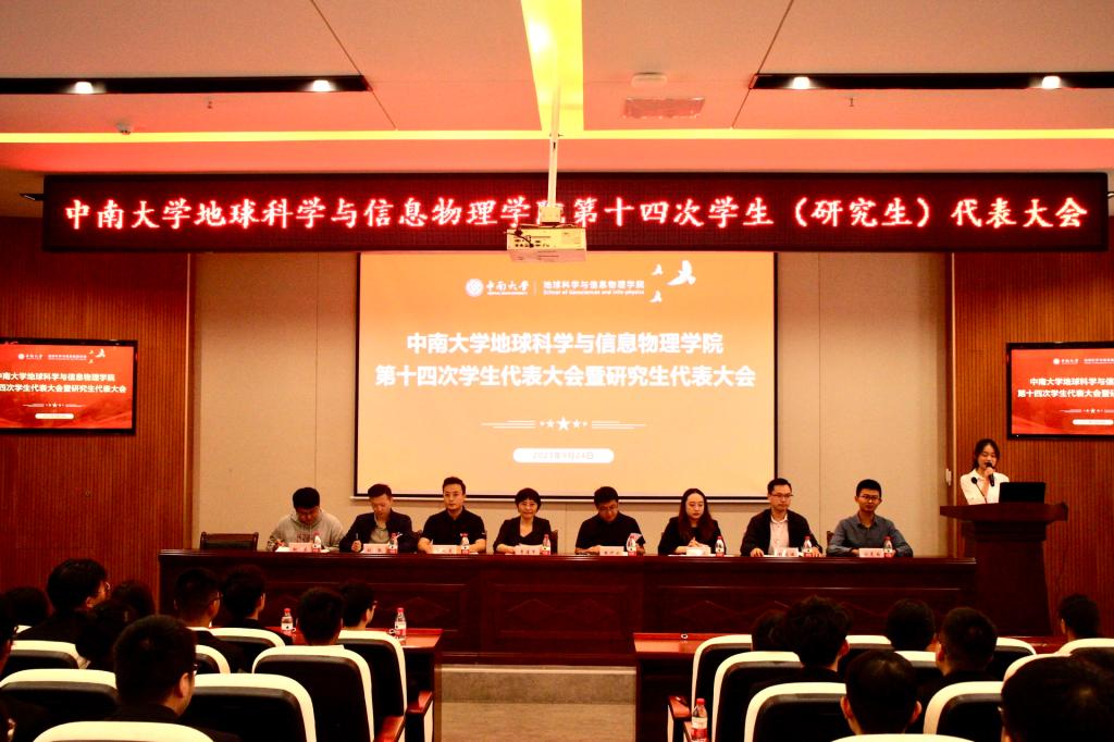 第十四次学生代表大会暨研究生代表大会在新校区地科楼127报告厅顺利召开。院党委副书记李建军,院团委书记刘琦,院团委副书记熊伊曲,中南大学团委学生副书记薛琛昊,辅导员刘凯、杨通田、杨晨雨、赵乐以及各年级学生代表出席本次大会。大会由寇浚哲同学主持。