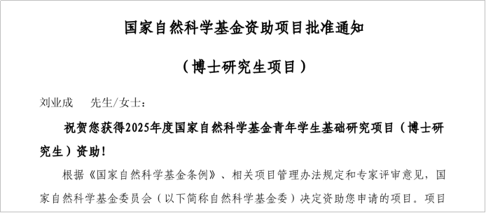 应用地球物理系博士研究生刘业成近日成功获批2025年度国家自然科学基金博士生项目(导师:李帝铨教授),资助经费30万元,资助期限为2年,成为博彩网站推荐-亚洲博彩平台排名