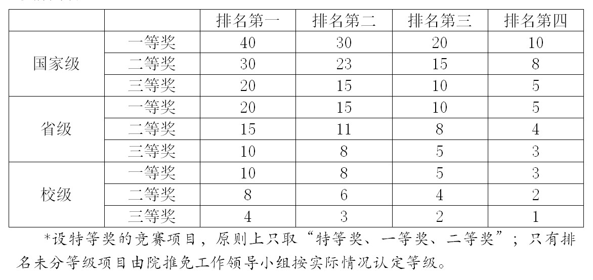 认定的各专业自行增列的竞赛项目)按级别、排名和奖励等级计分,取前四名(获奖人数超出4人时,按高等级优先、同等级学业成绩专业内相对排位靠前优先原则实施)。文体等竞技类比赛(包括学校相关部门及以上单位举办的各类文体竞赛,各类征文、演讲、辩论等比赛项目)按级别、排名和奖励等级计分,取前四名。
