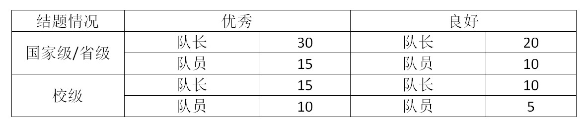4. 结题优秀的国家级/省级、校级大学生创新创业项目的负责人分别计30分、15分,其他参与者分别计15分、10分; 结题良好的国家级/省级、校级大学生创新创业项目的负责人分别计20分、10分,其他参与者分别计10分、5分。