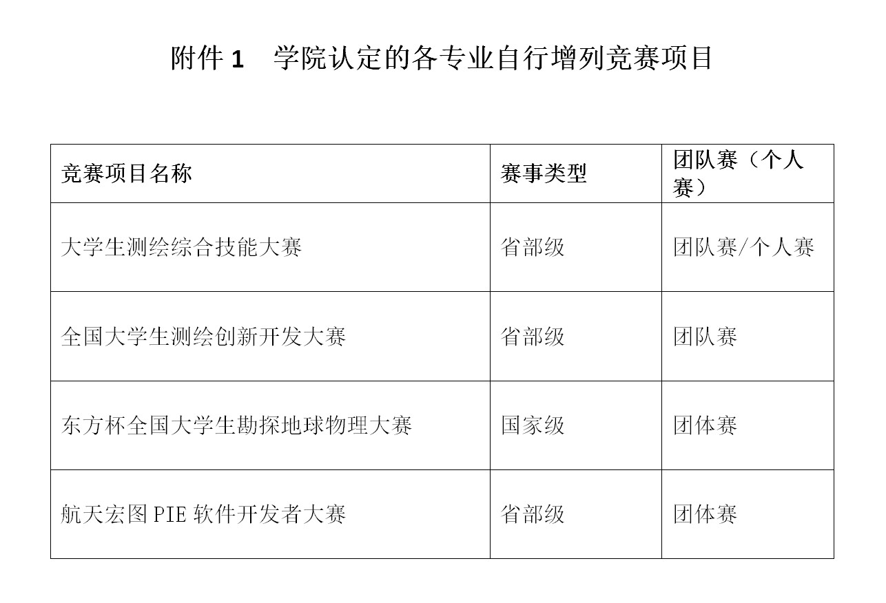 同类比赛项目获奖成绩按大类计最高等级(或校级或省级或国家级)1次,已获得学校专项加分的不重复加分,各专业自行增列的学校目录外竞赛项目(见附件1)加分时按上述相应标准计一半分。