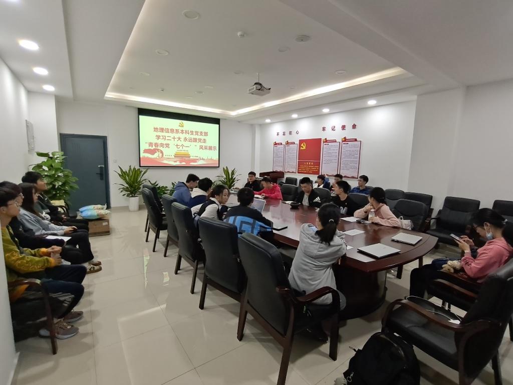 学习二十大,永远跟党走,奋进新征程。10月29日19:30,地理信息系本科生党支部于新校区地科楼214举办了“青春向党‘七个一’”风采展示活动,党支部书记刘凯同志出席并主持本次活动,支部25位同志到场参与此次活动。