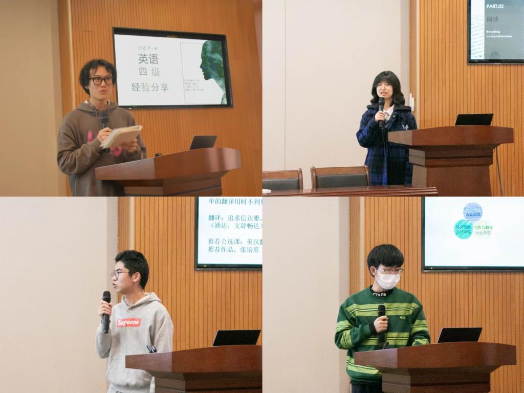 分享会开始,汤淼舟同学介绍了英语四六级考试的具体题型、分数占比、总体考试难度和详细考试流程。针对听力模块,他在审题、关键词和记录信息方面做了详细说明,并针对存在的听力问题做出了剖析。随后,针对阅读模块,金昱含同学着重强调了背单词的重要性,给出了五种单词的记忆方法。提出可以通过结合句子强化记忆和通过归纳积累写作和翻译词汇。之后,针对翻译和写作模块,夏卓扬同学强调翻译要追求信达雅,要把握好听力前的写作时间,并提醒大家注重专有名词、成语、俗语和各种高级表达的积累。最后,针对如何提高班级四级通过率模块,张夏宇同学再次强调了单词是重点,并建议班级成立英语小组进行打卡,组织模考,互帮互助,共同进步。