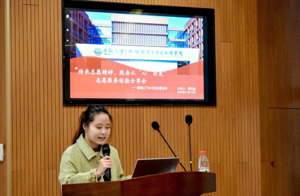 胡博懿同学分享志愿服务经验,由地信院团委学生会主席团成员崔红岩同学主持,地信院团委书记刘琦及各博彩网站推荐