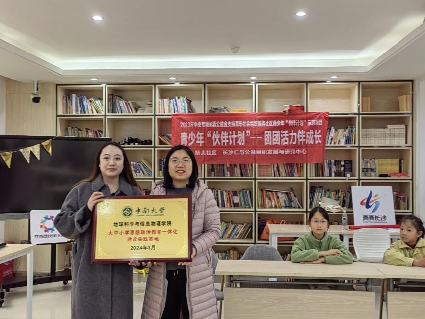 团委书记刘琦老师和社区负责人的指导下,宣讲团顺利开展了教育一体化建设实践基地授牌仪式,将桥头社区设立为中南大学“大中小学思想政治教育一体化建设”实践基地,以便更好地帮助居民了解地学知识,让他们在多样化的实践活动中对地学知识有更加深刻的体会与感悟。