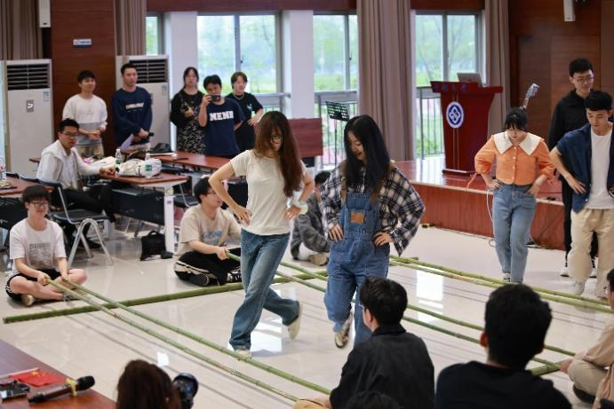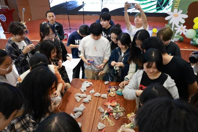 歌唱表演结束后,各族同学、老师们在壮族同学的帮助下,伴随着山歌,共同表演起了竹竿舞,竹竿一起一落,舞姿一开一合,将民族青春活力展现得淋漓尽致。随后,在壮族同学的指导下,活动参与者开始现场制作小香囊,小小的香囊包裹着春日繁花的幽香,也包裹着壮族人民的乡土浓情,更包裹着民族大团结的无限柔情。活动成员和壮族同学共同享用了五色糯米饭,糯米飘香,色彩绚丽,每一位同学、老师脸上都洋溢着来自三月三节日的春光,尽情领略浓厚的壮族风情。最后,在同学们的欢歌载舞中,本次活动也迎来了尾声。
