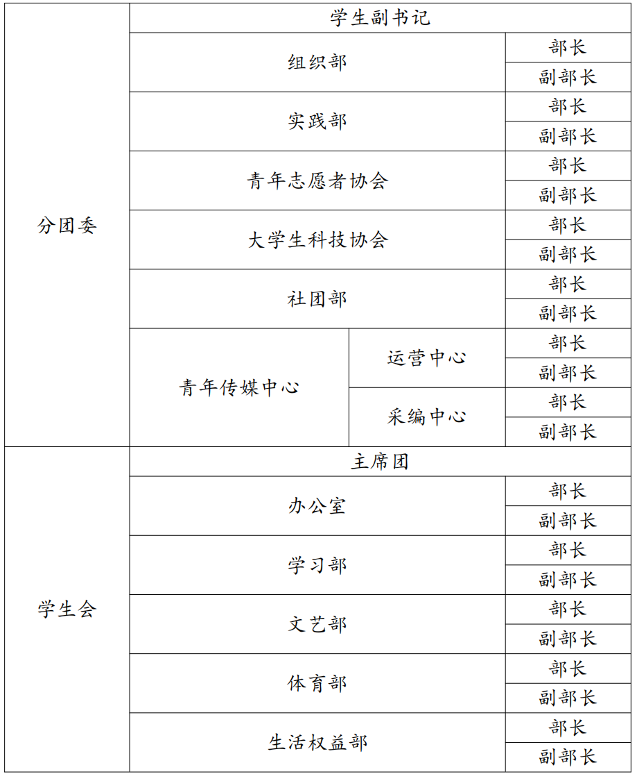 5.原则上竞选学生会主席团、分团委学生副书记职位者须有一年及以上分团委、学生会主要干部任职经验;如竞聘人在其他校级学生组织、党支部、团支部、班委会、社团及其他学生组织有一年及以上工作经历且能力突出者,也可参与竞选。